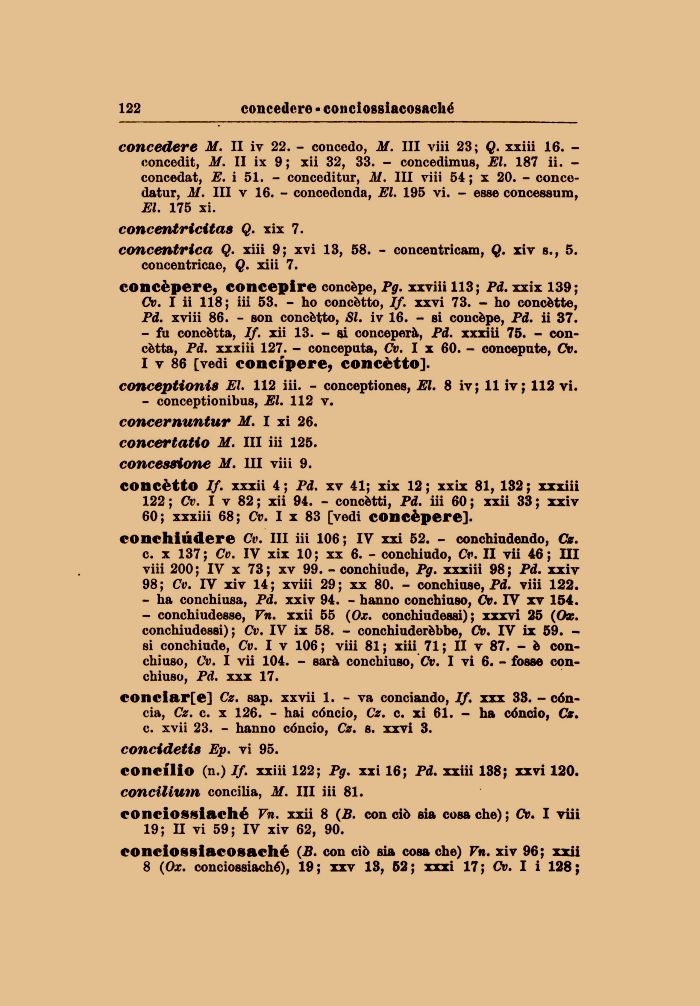 concilio (n.) If. xxiii 122; Pg. xxi 16; Pd. xxiii 138; xxvi 120. concilium concilia, M. Ili iii 81.