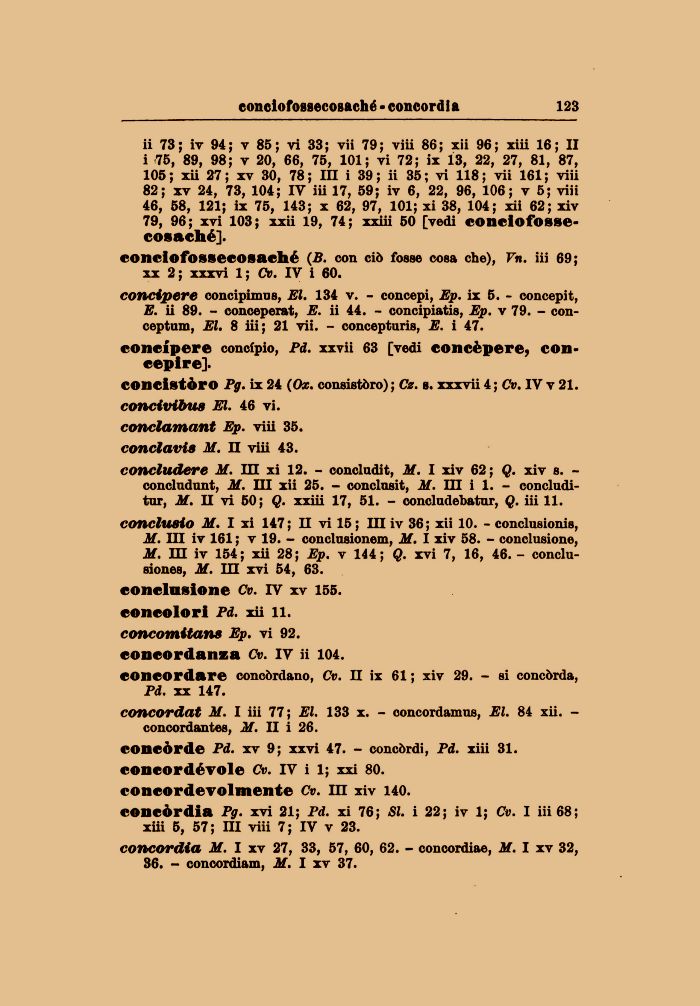ii 73; ir 94; v 85; vi 33; vii 79; viii 86; xii 96; xiii 16; II i 75, 89, 98; v 20, 66, 75, 101; vi 72; ix 13, 22, 27, 81, 87, 105 ; xU 27 ; xv 30, 78 ; in i 39 ; ii 35 ; vi 118 ; vii 161 ; viii 82; xv 24, 73, 104; IV iii 17, 59; iv 6, 22, 96, 106; v 5; viii 46, 58, 121; ix 75, 143; x 62, 97, 101; xi 38, 104; xii 62; xiv 79, 96; xvi 103; xxii 19, 74; xxiii 50 [vedi conciofossecosaché].