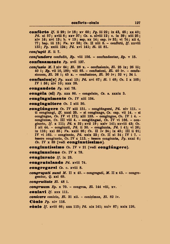 confòrto If. ii 29; iv 18; xv 60; Pg. iii 22; ix 43, 65; xx 40; Pd. xi 57 ; xviii 8 ; xxv 37 ; Cz. s. xlviii 12 ; c. ix 39 ; xiii 25 ; xiv 16; xvi 13 ; b. v 13 ; gap. xx 14; cap. iv 31; vi 74; xii 4, 77; bap. iii 13; Vn. xv 58; 0». II xiii 8. - confòrti, If. xxviii 135; Pg. xxiii 124; Pd. xvi 141; SI. iii 81. confugit E. ii 7.