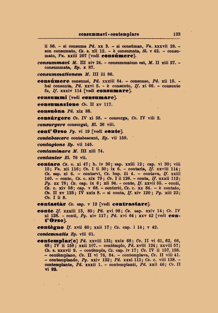 contemplale] Pd. xxviii 131; xxix 68; Cv. II vi 61, 62, 66, 68; IV ii 158; xxii 107. - contemplo, Pd. xviii 124; xxviii 57; Cz. s. xxxvii 9. - contčmpla, Cz. cap. iv 17; Cv. IV ii 157, 158.
