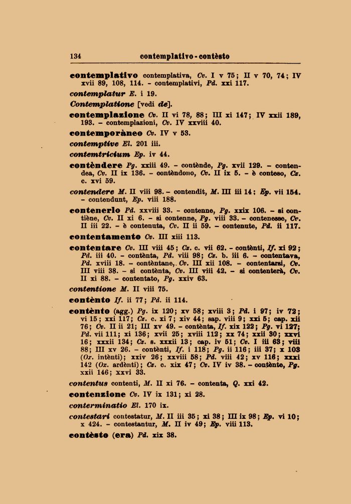contènto (agg.) Pg. ix 120; xv 58; xviii 3; Pd. i 97; iv 72; vi 15 ; xxi 117; Cz. c. xi 7; xiv 44; sap. viii 9; xxi 5; cap. xii 76; Cv. II ii 21; III xv 49. - contènta, If. xix 122; Pg. vi 127; Pd. vii 111; xi 136; xvii 25; xviii 112; xx 74; xxii 30; xxvi 16; xxxii 134; Cz. b. xxxii 13; cap. iv 51; Cv. i iii 63; viii 88; ni xv 26. - contènti, If. i 118; Pg. ii 116; iii 37; x 103 (Ox. intènti); xxiv 26; xxviii 58; Pd. viii 42; xv 116; xxxi 142 (Ox. ardènti); Cz. c. xix 47; Cv. IV iv 38. - contènte, Pg. xxii 146; xxvi 33.