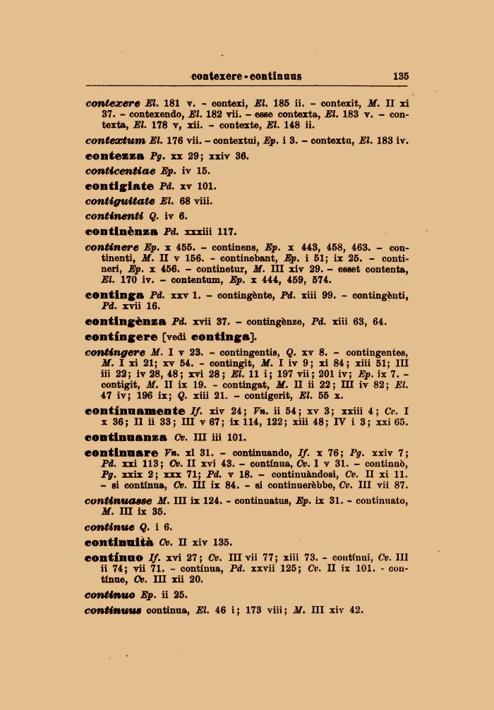 continere Ep. x 455. - continens, Ep. x 443, 458, 463. - continenti, M. II v 156. - continebant, Ep. i 51; ix 25. - conti-neri, Ep. x 456. - continetur, M. Ili xiv 29. - esset contenta, El. 170 iv. - contentum, Ep. x 444, 459, 574.