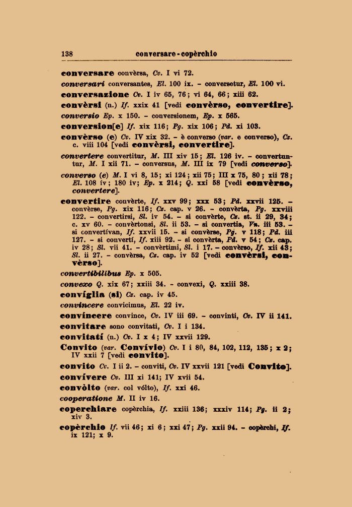 convito Cv. Iii 2. - conviti, Cv. IV xxvii 121 [vedi Convito], convivere Cv. Ili xi 141; IV xvii 54. convòlto (var. col vólto), If. xxi 46. cooperatione M. II iv 16.