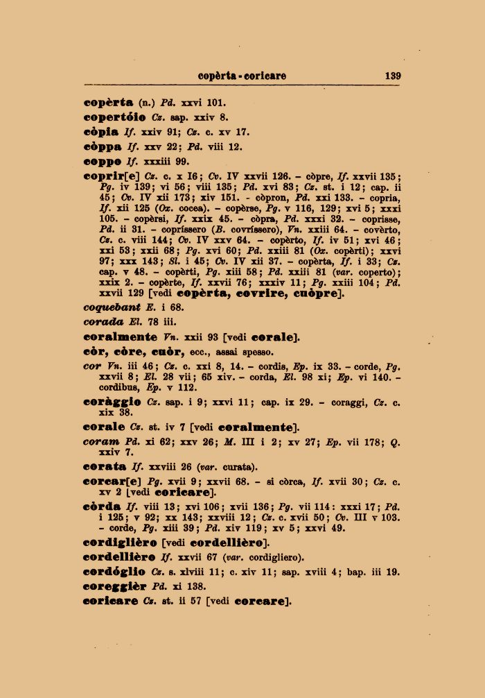 copèrta (n.) Pd. xxvi 101. copertóio Cz. sap. xxiv 8. còpia If. xxiv 91; Cz. c. xv 17. còppa If. xxv 22; Pd. viii 12. coppo lf. xxxiii 99.