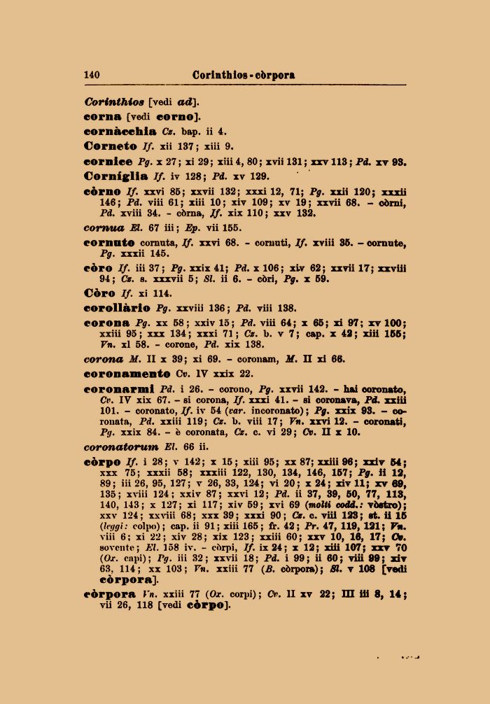 còrpo If. i 28 ; V 142 ; x 15 ; xiii 95 ; xx 87; xxiii 96 ; xxiv 64 ; xxx 75; xxxii 58; xxxiii 122, 130, 134, 146, 167; Pg. ii 12, 89; iii 26, 95, 127; v 26, 33, 124; vi 20; x 24; xiv 11; xv 69, 135; xviii 124; xxiv 87; xxvi 12; Pd. ii 37, 39, 50, 77, 113, 140, 143; x 127; xi 117; xiv 59; xvi 69 (molti codd.: vòstro); xxv 124; xxviii 68; xxx 39; xxxi 90; Cz. o. viii 123; st. ii 16 (leggi: colpo); cap. ii 91; xiii 165; fr. 42; Pr. 47, 119, 121; Vn. viii 6; xi 22; xiv 28; xix 123; xxiii 60; xxv 10, 16, 17; Cv. sovente; El. 158 iv. - còrpi, If. ix24; x 12; xiii 107; xxv 70 (Ox. capi); Pg. iii 32; xxvii 18; Pd. i 99; ii 60; viii 99; xiv 63, 114; xx 103; Vn. xxiii 77 (B. còrpora); SI. v 108 [vedi còrpora].