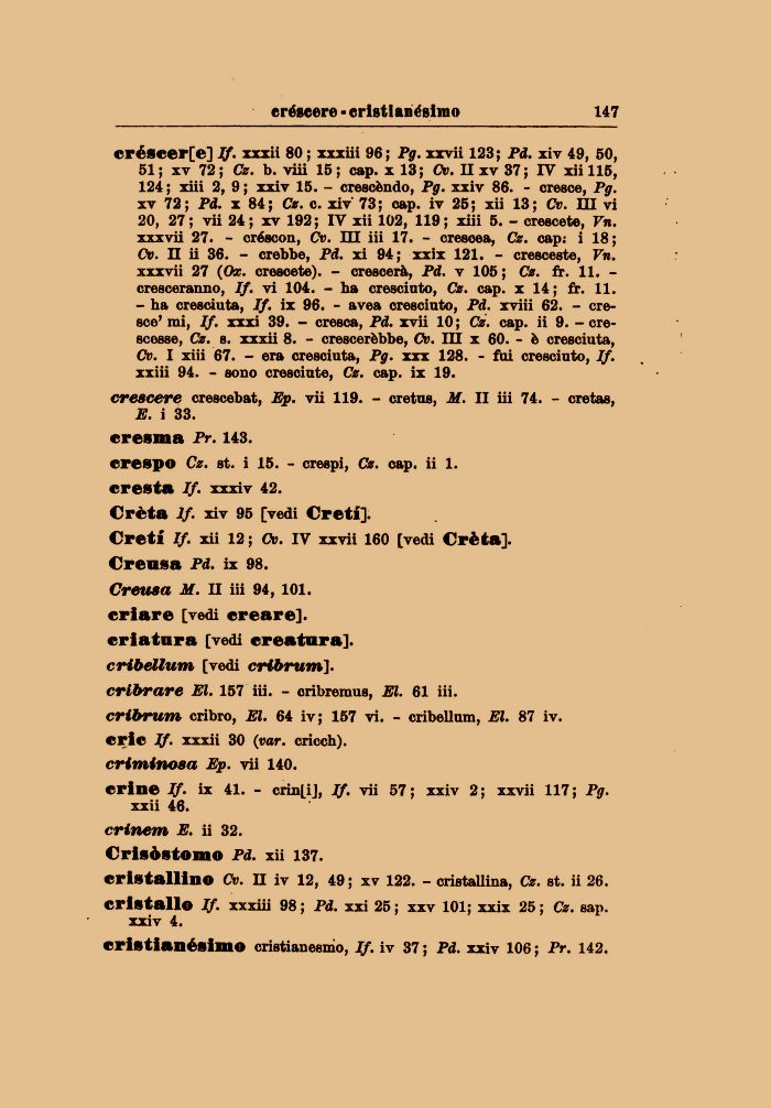 créscer [e] If. xxxii 80 ; xxxiii 96; Pg. xxvii 123; Pd. xiv 49, 50, 51; xv 72; Cz. b. viii 15; cap. x 13; Cv. II xv 37; IV xii 115, 124 ; xiii 2, 9 ; xxiv 15. - crescèndo, Pg. xxiv 86. - cresce, Pg. xv 72; Pd. x 84; Cz. c. xiv 73; cap. iv 25; xii 13; Cv. Ili vi 20, 27; vii 24; xv 192; IV xii 102, 119; xiii 5. - crescete, Vn. xxxvii 27. - créscon, Cv. Ili iii 17. - cresoea, Cz. cap: i 18 ; 0». Il ii 36. - crebbe, Pd. xi 94; xxix 121. - cresceste, Vn. xxxvii 27 (Ox. crescete). - crescerà, Pd. v 105; Cz. fr. 11. -cresceranno, If. vi 104. - ha cresciuto, Cz. cap. x 14 ; fr. 11. - ha cresciuta, If. ix 96. - avea cresciuto, Pd. xviii 62. - cresce'mi, If. xxxi 39. - cresca, Pd. xvii 10; Cz. cap. ii 9. - crescesse, Cz. s. xxxii 8. - crescerèbbe, Cv. Ili x 60. - è cresciuta, Cv. I xiii 67. - era cresciuta, Pg. xxx 128. - fui cresciuto, If.