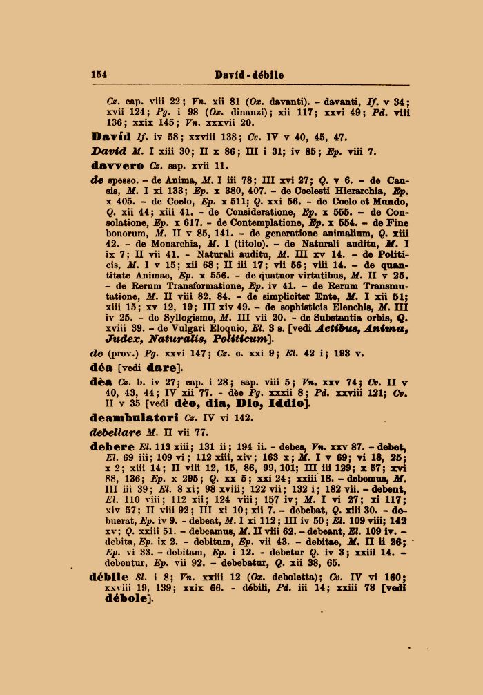 dèa Cz. b. iv 27 ; cap. i 28 ; sap. viii 5 ; Vn. xxv 74 ; Cv. II v 40, 43, 44; IV xii 77. - dèe Pg. xxxii 8; Pd. xxviii 121; Cv. II v 35 [vedi dèo, dia, Dio, Iddio], deambulatori Cz. IV vi 142. debellare M. U vii 77.
