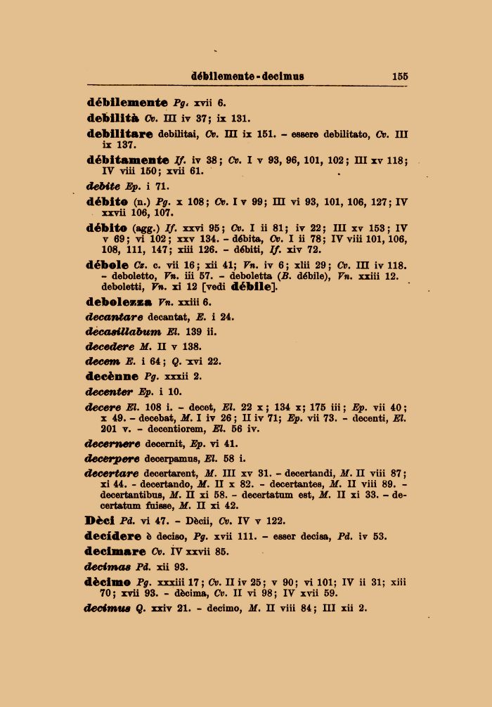 débito (n.) Pg. x 108; O. I v 99; m vi 93, 101, 106, 127; IV xxvii 106, 107.