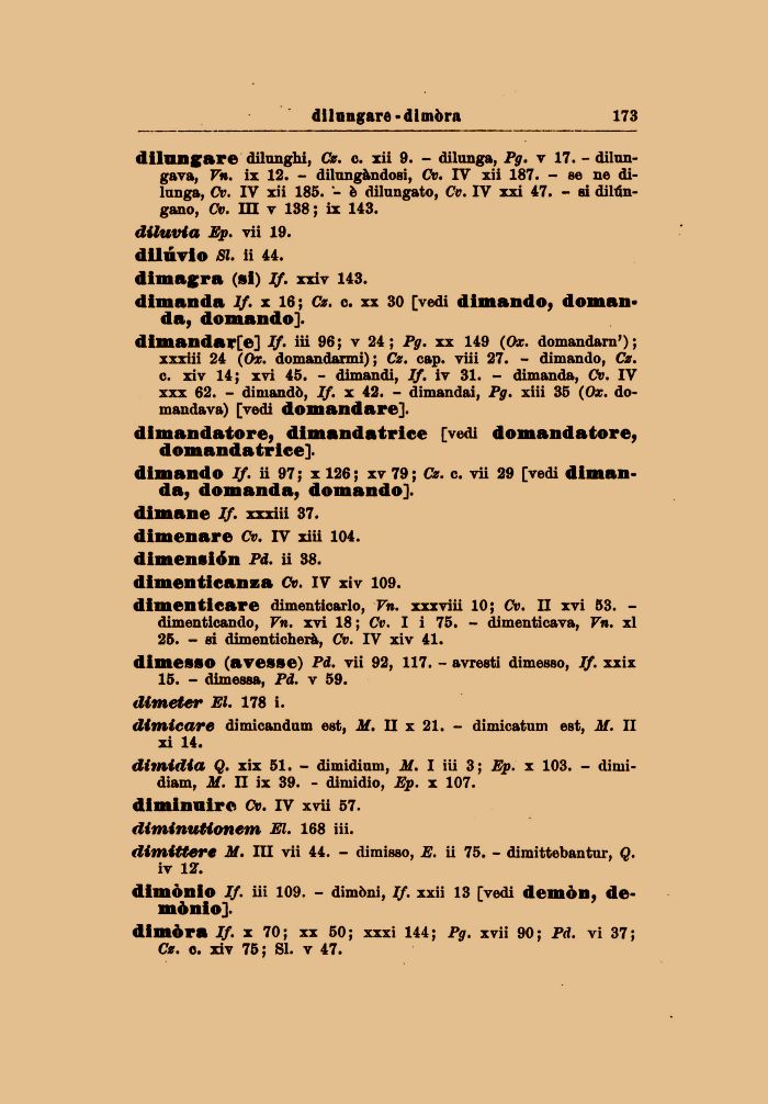 domandatrice]-dimando If. ii 97; x 126; xv 79; Cz. c. vii 29 [vedi dimanda, domanda, domando], dimane If. xxxiii 37. dimenare Cv. IV xiii 104. dimensión Pi. ii 38. dimenticanza Cv. IV xiv 109.