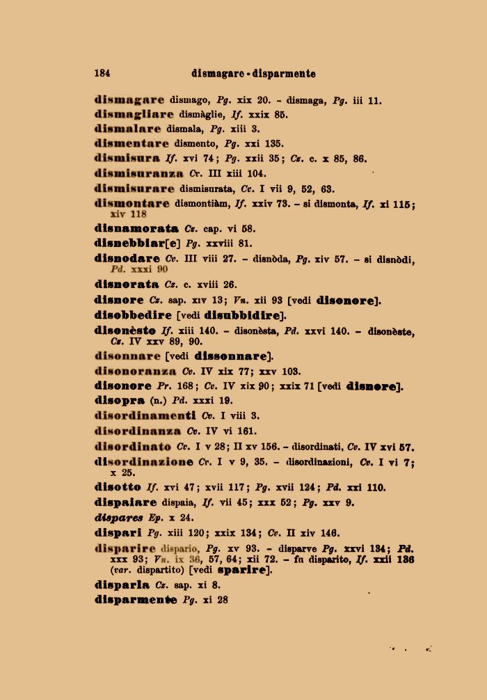 disotto If. xvi 47; xvii 117; Pg. xvii 124; Pd. xxi 110. dispaiare dispaia, If. vii 45 ; xxx 52 ; Pg. xxv 9. dispares Ep. x 24.