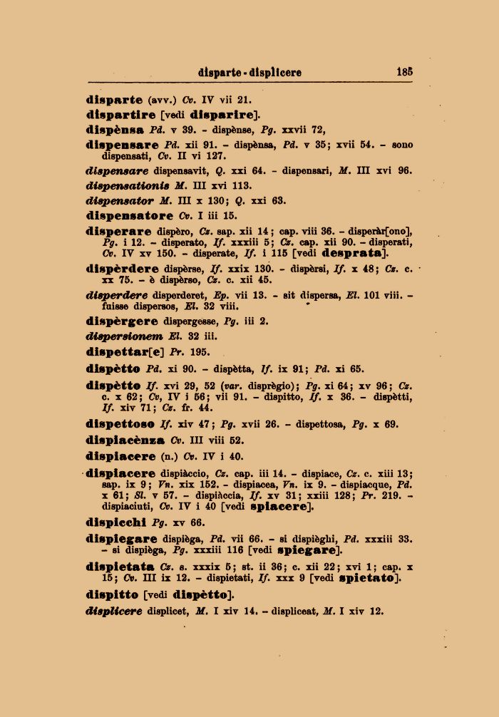 dispensati, Cv. II vi 127. dispensare dispensavi, Q. xxi 64. - dispensari, M. in xvi 96. dispensationis M. Ili xvi 113. dispensator M. Ili x 130; Q. xxi 63. dispensatore Cv. I iii 15.