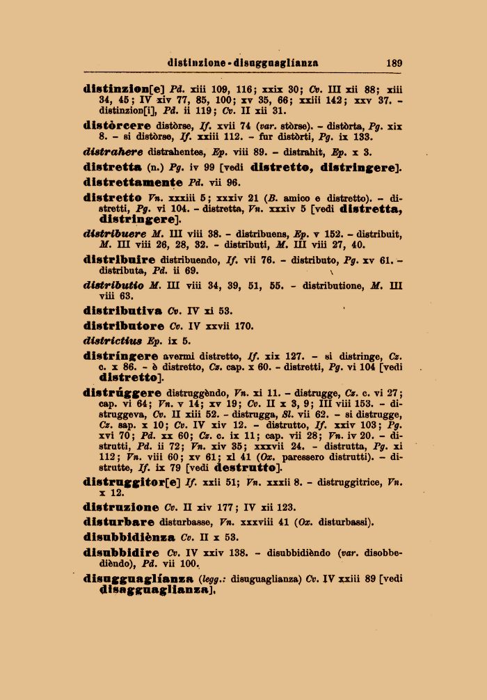 distruggere distruggèndo, Vn. xi 11. - distrugge, Cz. c. vi 27 ; cap. vi 64; Vn. v 14; xv 19; Cv. U x 3, 9; III viii 153. - distruggeva, Cv. n xiii 52. - distrugga, SI. vii 62. - si distrugge, Cz. sap. x 10; Cv. IV xiv 12. - distrutto, If. xxiv 103; Pg. xvi 70; Pd. xx 60; Cz. c. ix 11; cap. vii 28; Vn. iv 20. - distratti, Pd. ii 72; Vn. xiv 35; xxxvii 24. - distrutta, Pg. xi 112; Vn. viii 60; xv 61; xl 41 (Ox. paressero distrutti). - distrutte, If. ix 79 [vedi destrutto].