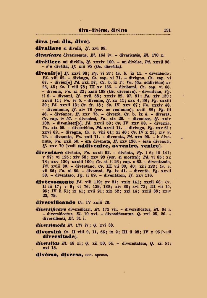 - divenia, Vn. xi 22; xxiii 198 (Ox. diveniva). - divenivan, Pg. ii 9. - divenni, If. xvii 88 ; xxxiv 22, 27, 91 ; Pg. xiv 139 ; xxvii 14; Vn. iv 5. - divenne, If. xx 41; xxx 4, 38; Pg. xxxiii 39; Pd. xxvii 13; Cz. fr. 18; Cv. IV xxv 67; Vn. xxxiv 48.