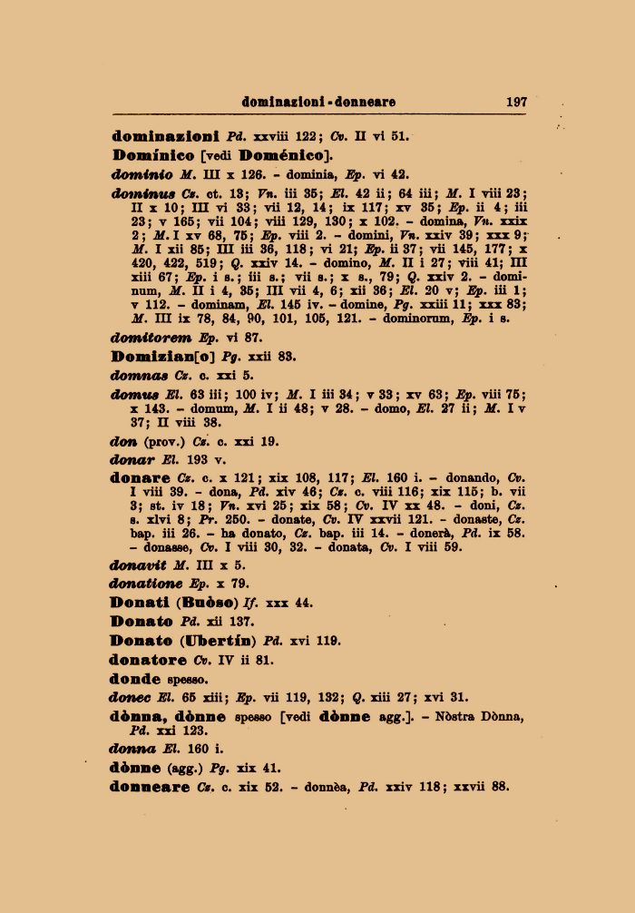dominila Ce. et. 13; Vn. iii 35; El. 42 ii; 64 iii; M. I viii 23; II x 10; m vi 33; vii 12, 14; ix 117; xv 35; Ep. ii 4; iii 23; v 165; vii 104; viii 129, 130; x 102. - domina, Vn. xxix 2 ; M. I xv 68, 75 ; Ep. viii 2. - domini, Vn. xxiv 39 ; xxx 9 ; M. I xii 85; HI iii 36, 118; vi 21; Ep. ii 37; vii 145, 177; x 420, 422, 519; Q. xxiv 14. - domino, M. II i 27; viii 41; m xiii 67; Ep. i s. ; iii s. ; vii s. ; x s., 79; Q. xxiv 2. - domi-num, M. U i 4, 35; III vii 4, 6; xii 36; El. 20 v; Ep. iii 1; v 112. - dominano, El. 145 iv. - domine, Pg. xxiii 11; xxx 83; M. IH ix 78, 84, 90, 101, 105, 121. - dominorum, Ep. i s.