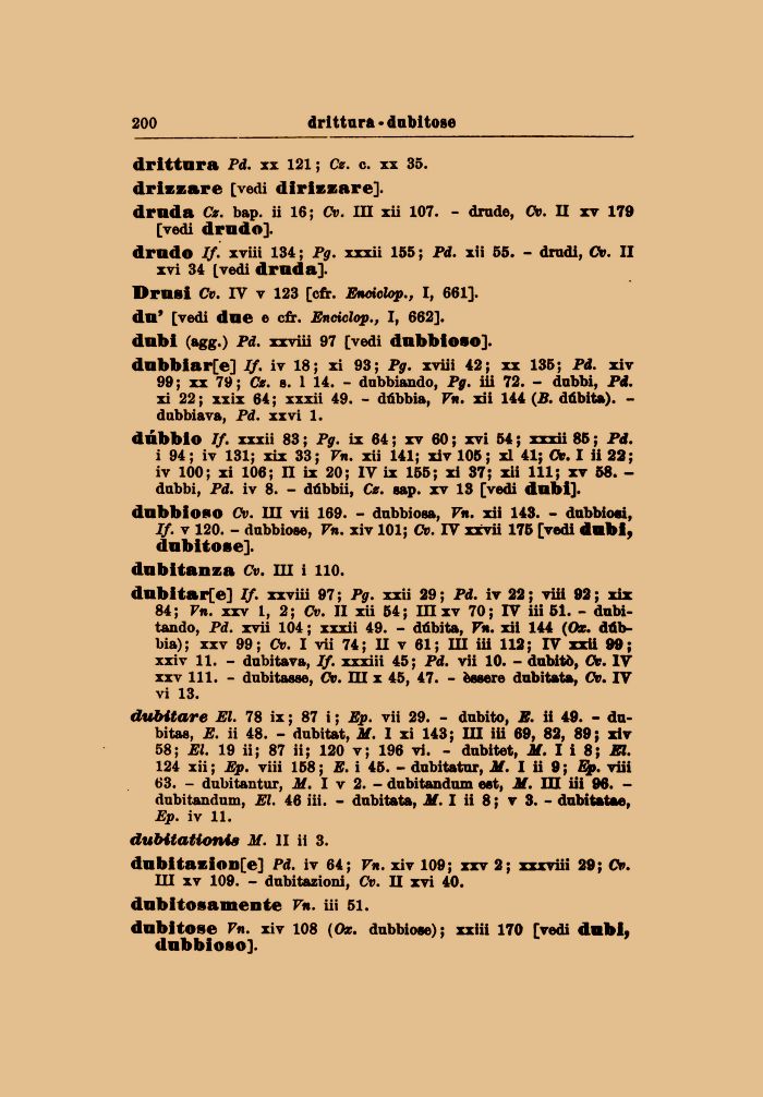 dubitarle] If. xxviii 97 ; Pg. xxii 29 ; Pd. iv 22 ; viii 92 ; xix 84; Vn. xxv 1, 2; Cv. II xii 54; in xv 70; IV iii 51. - dubitando, Pd. xvii 104 ; xxxii 49. - dtìbita, Vn. xii 144 (Ox. dùbbia); xxv 99; Cv. I vii 74; U v 61; III iii 112; IV xxii 99;