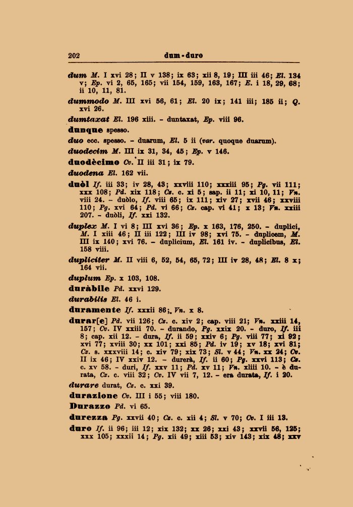 duo ecc. spesso. - duarum, El. 5 ii (var. quoque duarum). duodecimi M. HI ix 31, 34, 45; Ep. v 146. duodècimo Cv.'II iii 31; ix 79. duodena El. 162 vii.