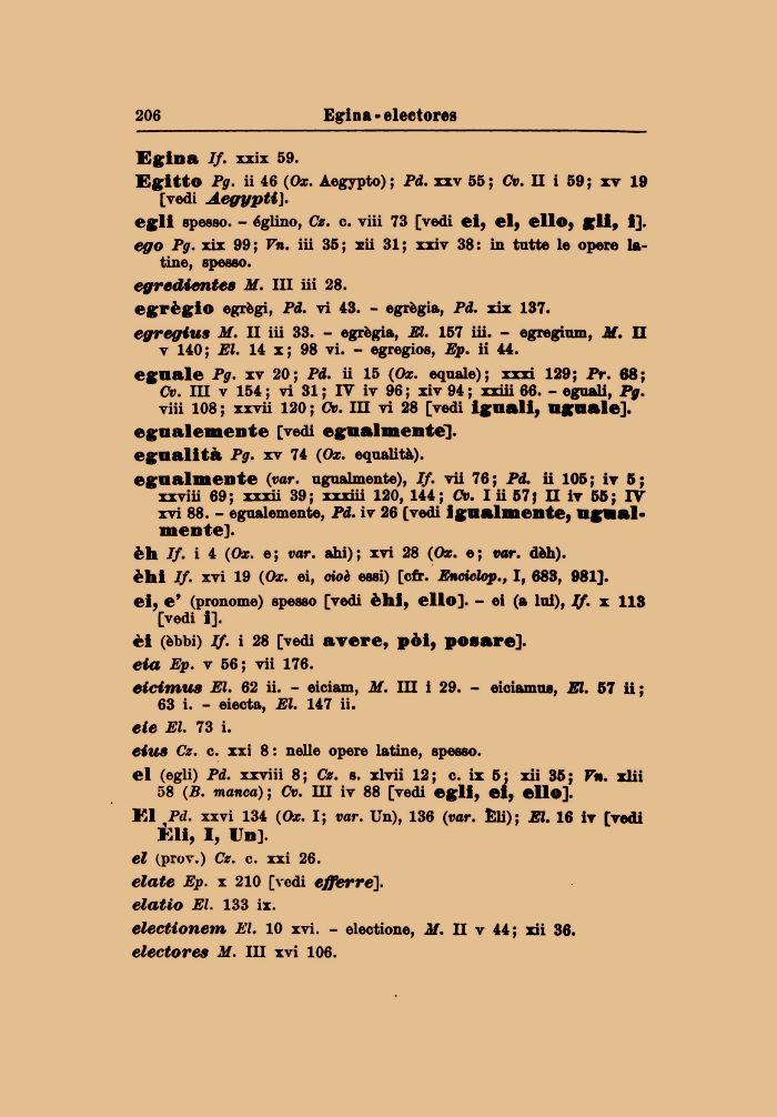 [vedi Aegypti]. egli spesso. - èglino, Cz. c. viii 73 [vedi ei, ei, elio, gii, i]. ego Pg. xix 99; Vn. iii 35; xii 31; xxiv 38: in tutte le opere latine, spesso. egredientea M. Ili iii 28.