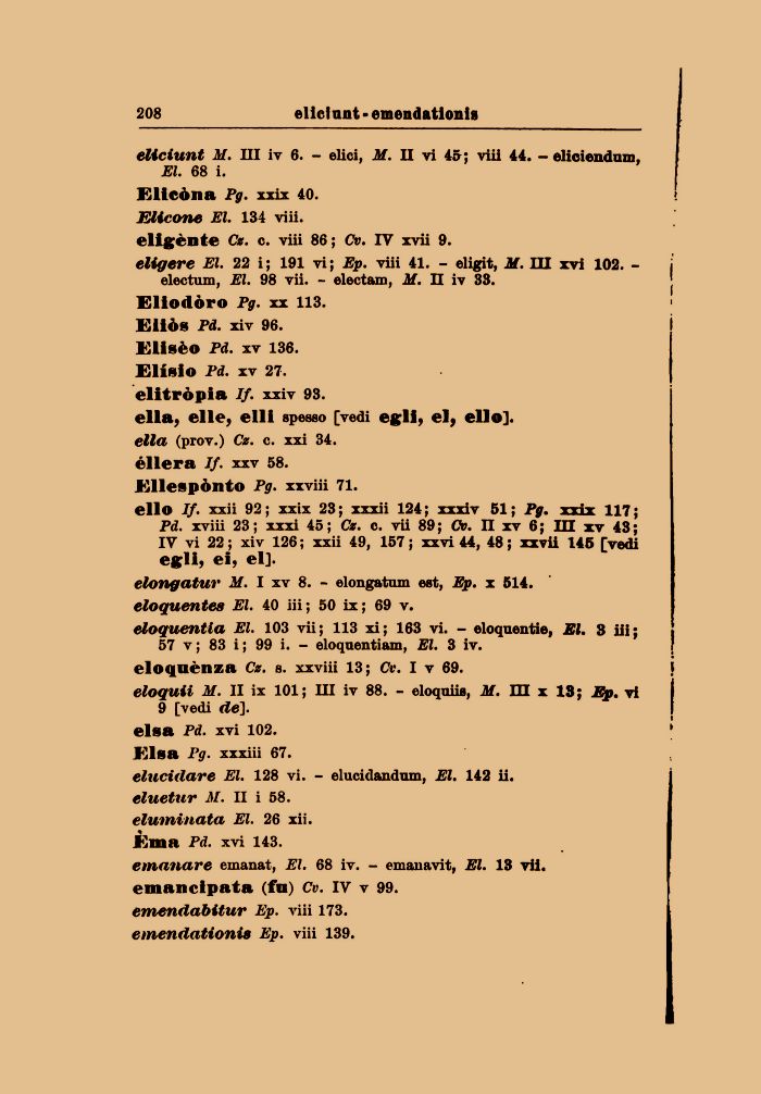 elio If. xxii 92; xxix 23; xxxii 124; xxxiv 51; Pg. xxix 117; Pd. xviii 23; xxxi 45; Cz. c. vii 89; Cv. II xv 6; IH xv 43; IV vi 22 ; xiv 126 ; xxii 49, 157 ; xxvi 44, 48 ; xxvii 145 [vedi egli, ei, el]. elongatur il. I xv 8. - elongatum est, Ep. x 514. eloquentes El. 40 iii ; 50 ix ; 69 v.