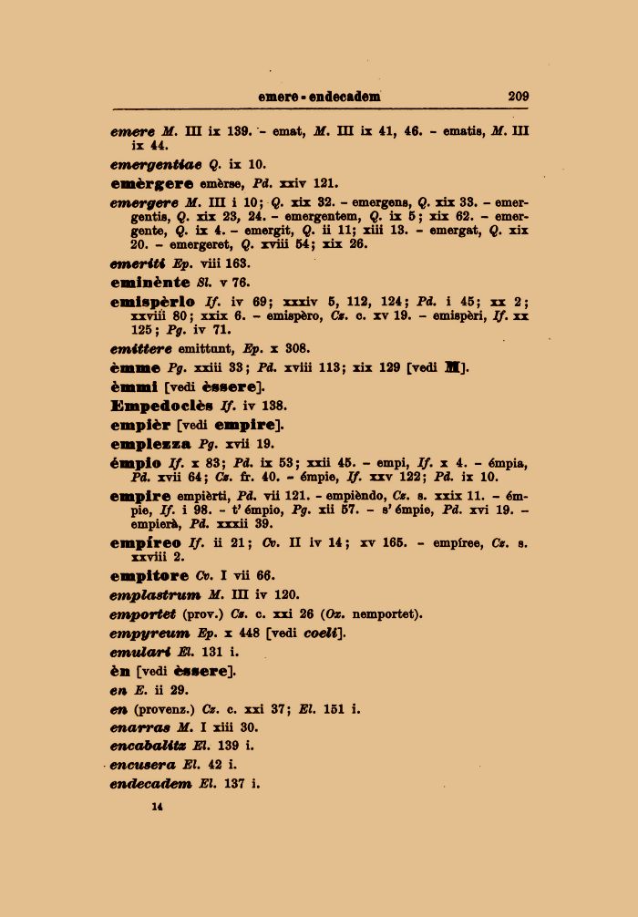 émpio If. x 83; Pd. ix 53; xxii 45. - empi, If. x 4. - émpia, Pd. xvii 64; Cz. fr. 40. - émpie, If. xxv 122; Pd. ix 10.