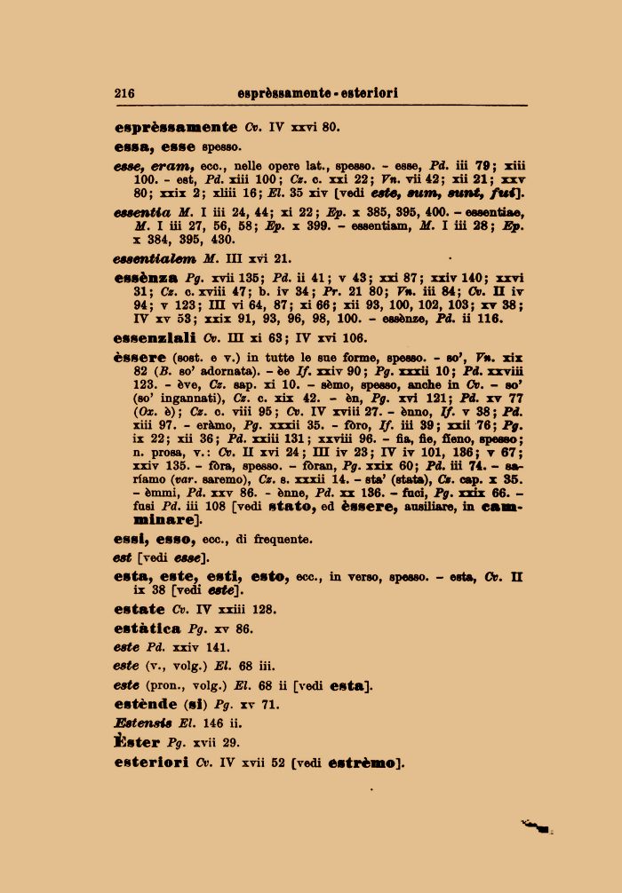esse, eram, ecc., nelle opere lat., spesso. - esse, Pd. iii 79; xiii 100. - est, Pd. xiii 100 ; Cz. c. xxi 22 ; Vn. vii 42 ; xii 21 ; xxv 80; xxix 2; xliii 16; El. 35 xiv [vedi este, sum, sunt, fui].