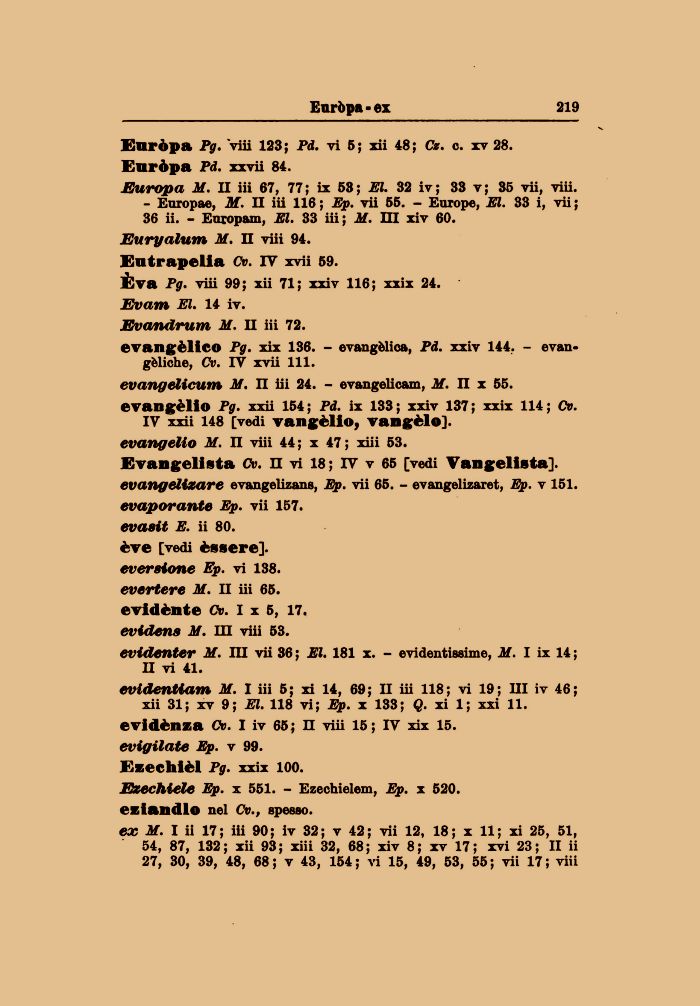 evangèlico Pg. xix 136. - evangèlica, Pd. xxiv 144. - evangèliche, Cv. IV xvii 111.