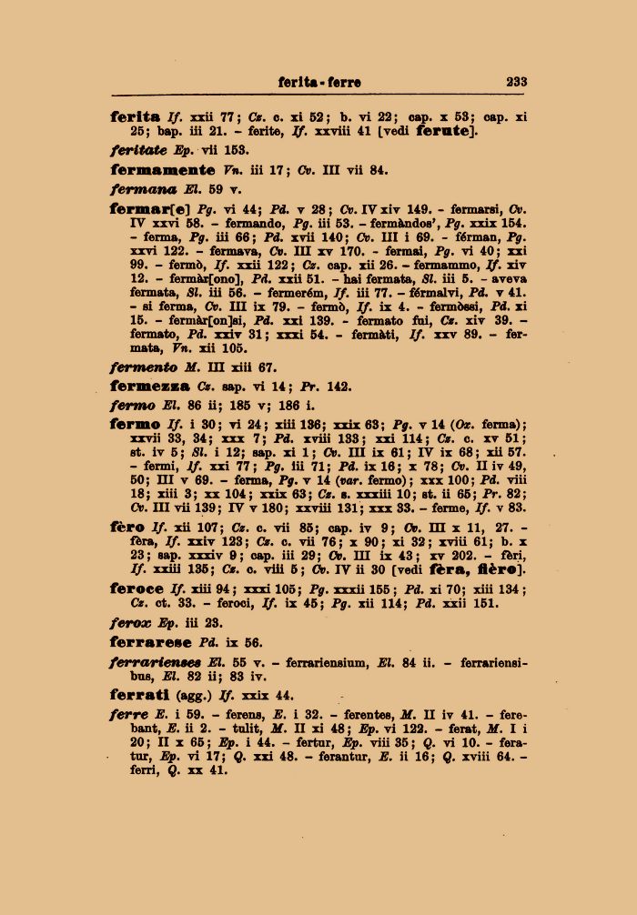 fero If. xii 107; Cz. c. vii 85; cap. iv 9; Cv. m x 11, 27. -fòra, If. xxiv 123; Cz. c. vii 76 ; x 90 ; xi 32 ; xviii 61; b. x 23 ; sap. xxxiv 9 ; cap. iii 29 ; Cv. IU ix 43 ; xv 202. - fèri, If. xxiii 135; Cz. o. viii 5 ; Cv. IV ii 30 [vedi fèra, fièro].