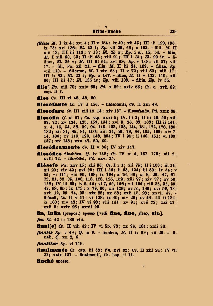 xii 20; xiv 42; xvi 90; m i 56; ii 83, 124; iii 89; iv 54; v 55; vi 111; viii 85, 168; ix Ì04; x 16, 68; xi 9, 29, 47, 61, 72, 81, 88, 95, 103, 113, 123, 125, 152; xiii 77; xiv 97; xv 50, 128 ; IV iii 63; iv 9, 46 ; vi 7, 99, 156 ; vii 139 ; viii 26, 32, 39, 42, 68, 85; ix 173; x 79, 90; xii 126; xv 51, 160; xvi 59, 78; xvii 12, 29, 74, 93; xix 83; xx 58; xxii 15, 28; xxvii 47. -filòsofi, Oc. II v 11; vi 128; ix 60; xiv 29; xv 46; III ii 122;