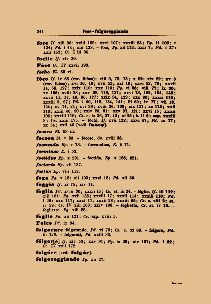 foce If- xiii 96; xxiii 129; xxvi 107; xxxiii 83; Pg. ii 103: v 124; Pd. i 44 ; xiii 138. - foci, Pg. xii 112; xxii 7; Pd. i 37: xxii 153; Cr. I iii 36.