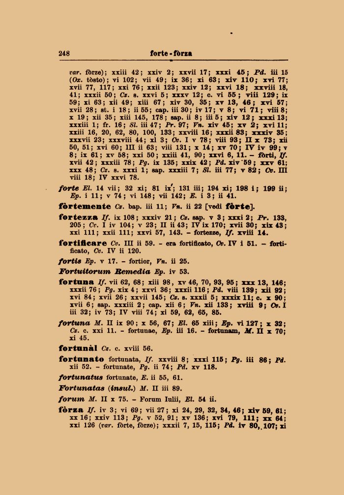 forte El. 14 vii; 32 xi; 81 ix'; 131 iii; 194 xi; 198 i; 199 ii; Ep. i 11; v 74; vi 148; vii 142; E. i 3 ; ii 41.