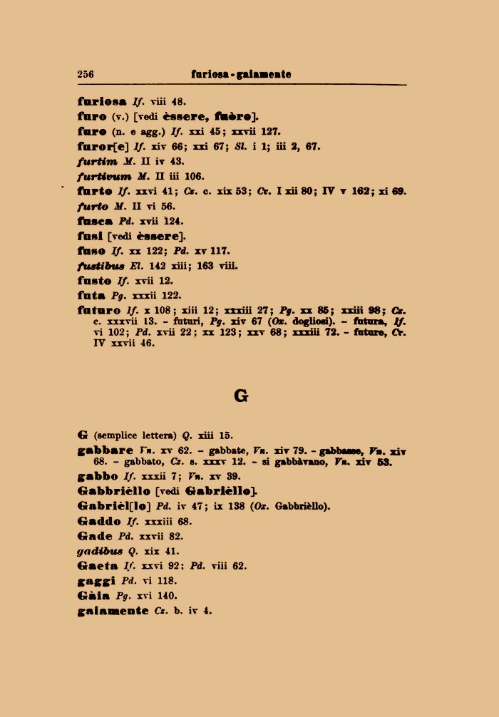 68. - gabbato, Cz. e. xxxv 12. - si gabbàvano, F». xiv 53. gabbo If. xxxii 7; Vn. xv 39. Gabbrièllo [vedi Gabriello]. Gabriello] Pd. iv 47; ix 138 (Ox. Gabbrièllo). Gaddo If. xxxiii 68. Gnde Pd. xxvii 82. gadibus Q. xix 41. Gaeta If. xxvi 92: Pd. viii 62. gaggi Pd. vi 118. Gàia Pg. xvi 140. gaiamente Cz. b. iv 4.