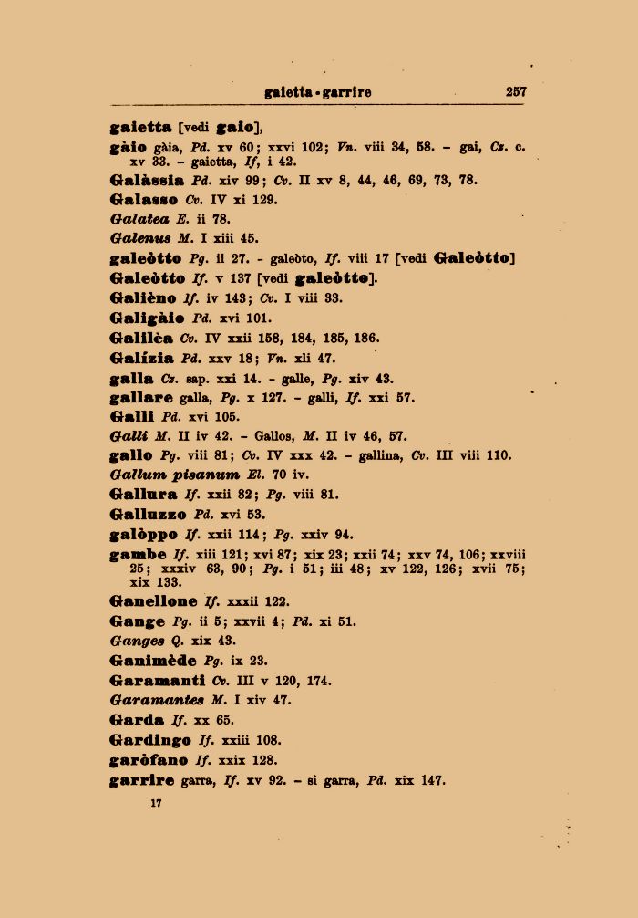 xv 33. - gaietta, If, i 42. Galàssia Pd. xiv 99 ; Cv. II XV 8, 44, 46, 69, 73, 78. Galasso Cv. IV xi 129. Galateo, E. ii 78. Galenus M. I xiii 45.