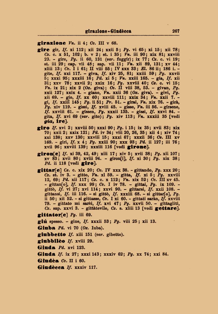 gire gir, If. xi 112; xii 24; xxii 5; Pg. vi 65; xi 15; xii 78; Cz. c. x 51, 102; b. v 2; st. i 35; Vn. iii 90; xix 81; xxviii 23. - gire, Pg. ii 60, 131 (var. fuggir); ix 77; Cz. e. vi 19; st. iii 29; cap. vii 48; sap. vii 11; Vn. xii 89, 131; xv 44; xliii 13; Cv. I i 61; II vUi 55; IV xxx 33; El. 86 ii; 186 i. -gite, If. xxi 117. - giva, If. xiv 25, 81; xxiii 59 ; Pg. xxvii 5; xxxi 95; xxxiii 16; Pil. xi 5; Vn. xxiii 165. - già, If. xii 31; xxv 78; xxvii 2; xxix 16; Pg. xxviii 40; Cz. c. vi 15; Vn. ix 21; xix 2 (Ox. giva); Cv. II viii 38, 53. - glvan, Pg. xxii 127 ; xxix 4. - giano, Vn. xxii 36 (Ox. giva). - givi, Pg. xii 69. - glo, If. xx 60; xxviii 111; xxix 34; Vn. xxii 7. -gl, If. xxiii 145; Pg. ii 51; Pr. 51. - girai, Vn. xix 76. - girà, Pg. xiv 119. - gissi, If. xviii 45. - gisse, Vn. iii 56. - girsene, If. xxviii 61. - glssen, Pg. xxxii 135. - gissi, If. xxvi 84. -gita, If. xvi 69 (var. gito) ; Pg. xiv 113 ; Vn. xxxiii 35 [vedi già, ire].