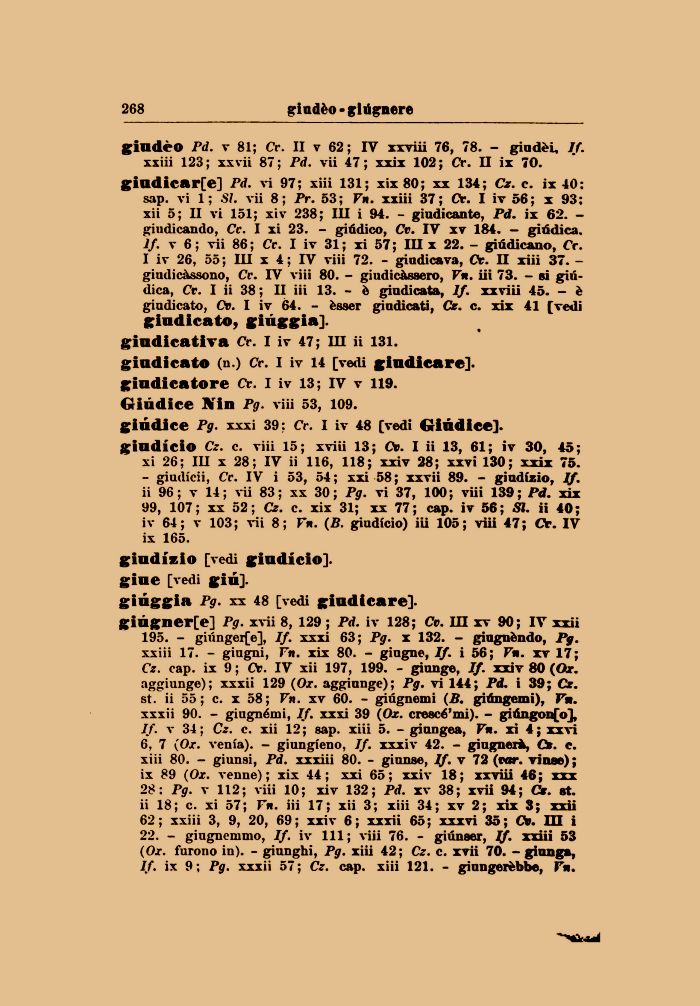 giudicarle] Pd. vi 97; xiii 131; xix 80; xx 134; Cr. c. ix 40: sap. vi 1; vii 8; Pr. 53; Vn. xxiii 37; Cr. I iv 56; x 93: