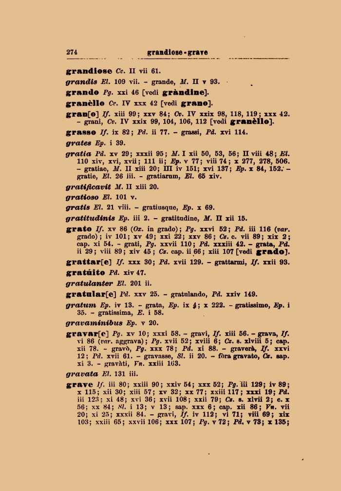 grandioso Cv. II vii 61. grandis El. 109 vii. - grande, M. II v 93. grando Pg. xxi 46 [vedi gràndine], granèllo Cr. IV xxx 42 [vedi grano].