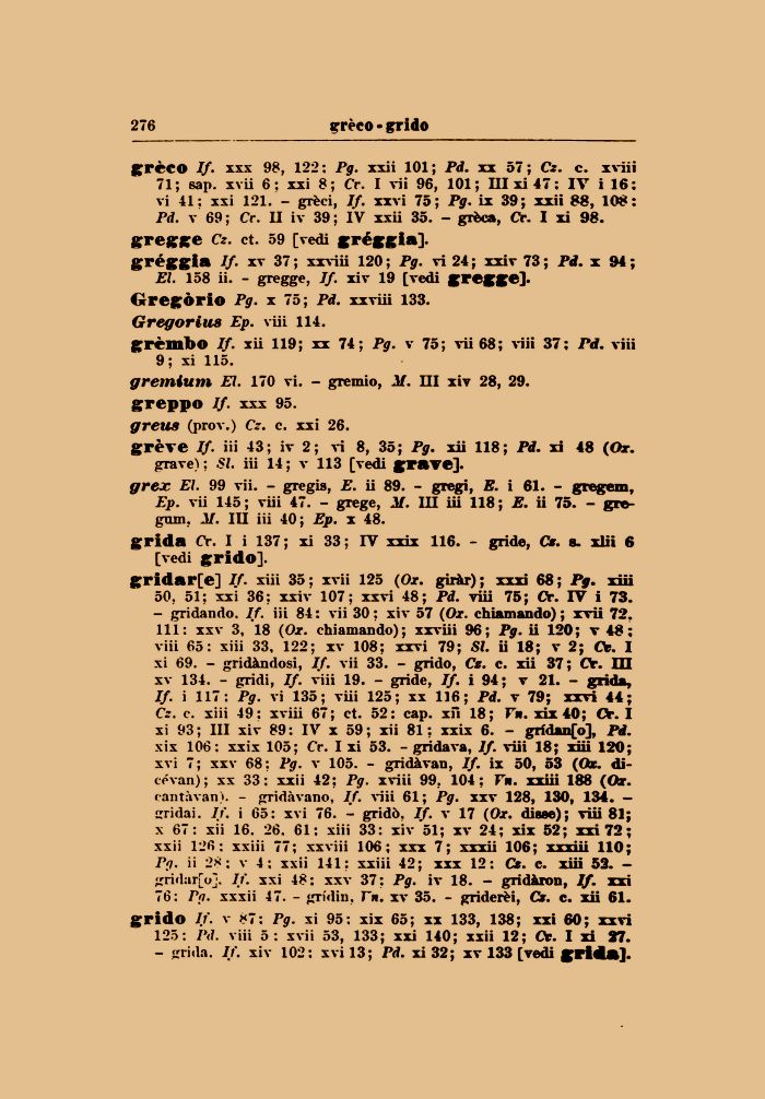 greco If. xxx 98, 122: Pg. xxii 101; Pd. xx 57; Cz. c. xviii 71; sap. xvii 6 : xxi 8 ; Cr. I vii 96, 101; IIIxi47: IV i 16: vi 41: xxi 121. - grèci, If. xxvi 75; Pg. ix 39; xxii 88, 108: Pd. v 69; Cr. II iv 39; IV xxii 35. - grèca, Cr. I xi 98. gregge Cz. et. 59 [vedi gréggia].