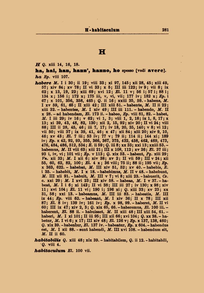 habere M. I i 30; ii 19; viii 33; xi 97, 145; xii 28, 45; xiii 49, 57 ; xiv 84 ; xv 78 ; II vi 33 ; x 5 ; HI iii 122 ; iv 9 ; vii 8 ; ix 62; x 13, 19, 22; xiii 69; xvi 12; El. 11 v; 56 i; 57 i; 88 i; 134 x; 156 i; 172 x; 175 iii, v, vi, vii; 177 iv; 182 x; Ep. i 67; x 101, 356, 358, 465; Q. ii 16; xxiii 35, 59.-habens, M. I xv 59, 61, 65; H xiii 42; III xiii 51. - habente, M. II ii 22; xiii 32. - habentes, M. I xiv 49 ; III iii 111. - habendo, M. II x 28. - ad habendam, El. 173 ii. - habeo, Ep. viii 81, 82. - habet, M. I iii 29; iv 16; v 62; vi 1, 3; viii 1, 2, 18; ix 1, 8, 17; x 13; xi 39, 43, 48, 82, 130; xii 2, 15, 92; xiv 20; II vi 24; viii 88; IU ii 28, 45, 46 ; iii 7, 17; iv 18, 20, 35, 140; v 8; vi 12; vii 50; viii 37; ix 39, 41, 46; x 47; xii 84; xiii 20; xiv 9, 10, 46; xv 43; El. 7 iii; 53 i'v; 77 v; 79 ii; 114 ii; 144 xi; 189 iv; Ep. x 42, 92, 93, 355, 366, 367, 375, 432, 458, 463, 469, 473, 476, 484, 486, 512, 534; E. ii 59 ; Q. iii 8; xx 33; xxi 13 ; xxiii 53.-habemus, M. II viii 63 ; xiii 21 ; in x 108, 112 ; xv 26 ; El. 37 iii ; 93 i, iv, vi ; 101 vii ; Ep. v 113 ; Q. xix 53. - habent, Pg. xiii 29 ; Vn. xii 33; M. I xii 6 ; xiv 38 ; xv 2 ; II vii 59 ; III v 24 ; xii 55, 60, 62, 82, 100; El. 4 x; 36 viii; 75 ii; 88 ii; 195 vii; Ep. x 363, 622. - habebat, M. Ili xiv 51, 52 ; xv 40. - babebis, E. i 35. - habebit, M. I x 18. -habebimus, M. II v 48. - habebunt, M. Ili xii 91. -habuit, M. III v 7; vi 8; xiii 23. - habuerit, Cz. c. xxi 29; M. I xvi 23; III xiv 58. - habeas, M. I v 37. - ha-beat, M. I i 6; xi 142; II vi 38; III iii 27 ; iv 130; x 98; xiv 11; xvi 104; El. 11 vi; 190 i; 196 xi; Q. xiii 33; xv 23; xx 31, 58 ; xxi 13. - habeamus, M. Ili iii 83. .- habeatis, M. III ix 44; Ep. viii 52. - habeant, M. I xiv 36; II x 78; III xii 87; El. 8 iv; 139 iv; 161 iv; Ep. x 98, 99.-haberet, M. II vi 60; III ix 47; xiv 2, 3; Q. xix 65, 66. -haberemus, El. 100 iii. -haberent, El. 88 ii. - habuisset, M. II xiii 48 ; III xiii 54, 61. -haberi, M. I xi 101 ; II iii 95 ; III xii 66 ; xvi 104 ; Q. xx 38.- ha-betur, M. I vi 6; x 17; HI xiv 48; El. 126 v; Ep. x 137, 138, 460; Q. xix 39. -habentur, El. 137 iv. - habeatur, Ep. x 604. - habendus est, M. I xii 88. - sunt habendi, M. III xvi 108. -habendum sit, M. U ii 60.