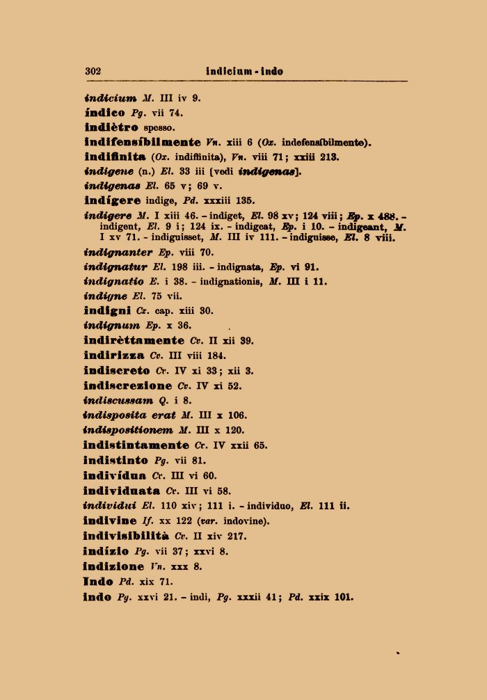 indignatur El. 198 iii. - indignata, Ep. vi 91. iěldignatio E. i 38. - iudignationis, M. IH i 11. indigne El. 75 vii. indigni Cz. cap. xiii 30. indignum Ep. x 36. indirčttamente Cv. II xii 39. indirizza Cv. Ili viii 184. indiscreto Cv. IV xi 33; xii 3. indiscrezione Cv. IV xi 52. indiacuaaam Q. i 8. indisposita erat M. Ili x 106. indispositionem il. HI x 120. indistintamente Cr. IV xxii 65. indistinto Pg. vii 81. individua Cr. IH vi 60. individuata Cr. Ili vi 58.