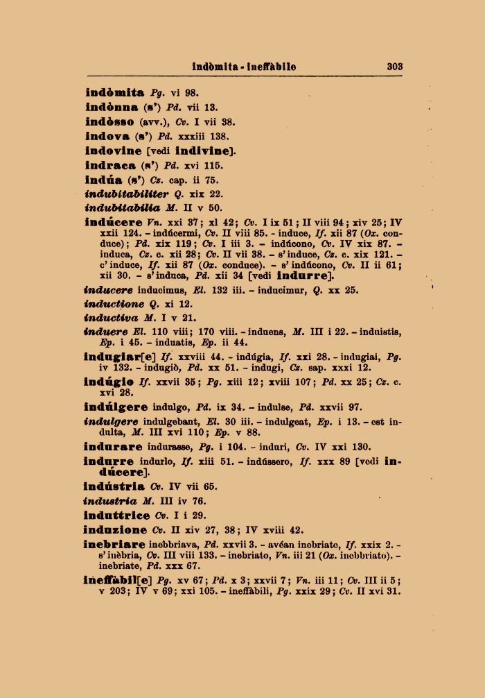 indònna (s') Pd. vii 13. indòsso (avv.), Cv. I vii 38. indova (s') Pd. xxxiii 138. indovine [vedi indivine], indraca (s') Pd. xvi 115. indua (s') Cz. cap. ii 75. indubltabiliter Q. xix 22. indubilabilia M. II v 50.