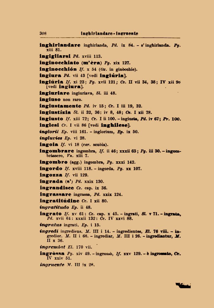 inglorii Ep. viii 161. - inglorium, Ep. ix 50. ingluvie» Ep. vi 28. ingoia If. vi 18 (rar. scuòia).