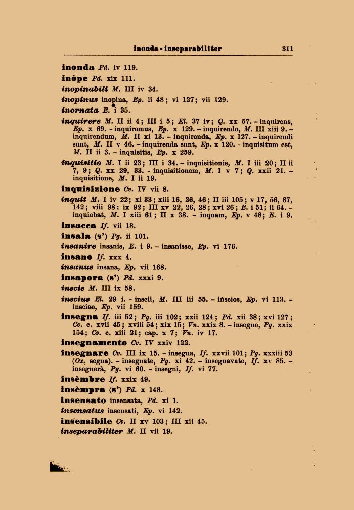 inquit M. I iv 22; xi 33 ; xiii 16, 26, 46 ; II iii 105 ; v 17, 56, 87, 142 ; viii 98 ; ix 92 ; in xv 22, 26, 28 ; xvi 26 ; E. i 51 ; ii 64. -inquiebat, AI. I xiii 61 ; II x 38. - inquam, Ep. v 48; E. i 9. insacca If. vii 18. insala (s') Pg. ii 101.