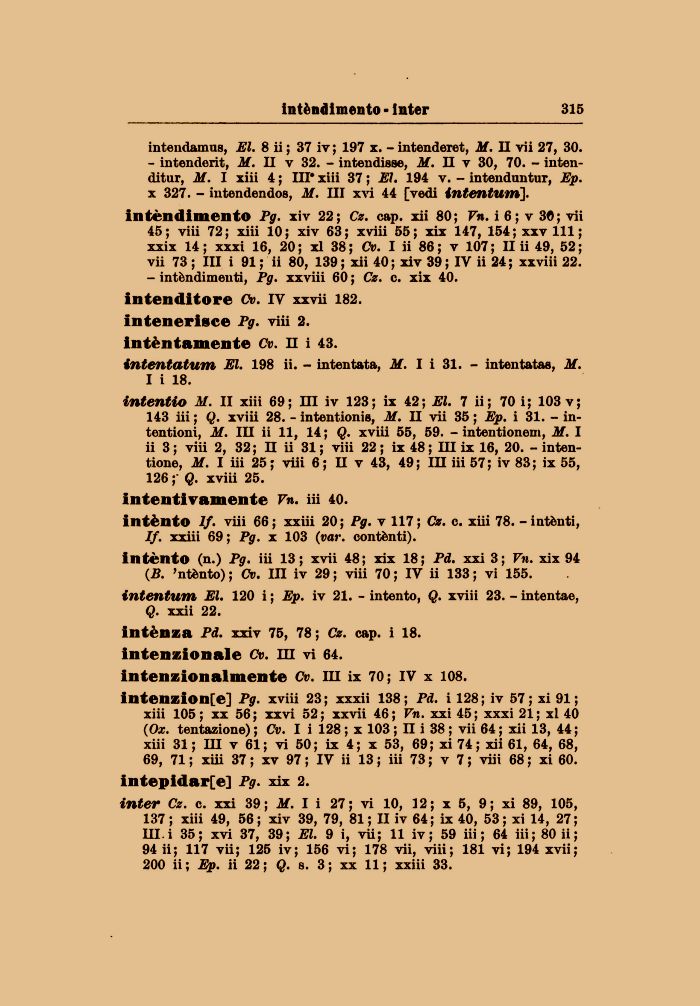 intendimento Pg. xiv 22; Cz. cap. xii 80; Vn. i 6; v 30; vii 45; viii 72; xiii 10; xiv 63; xviii 55; xix 147, 154; xxv 111; xxix 14 ; xxxi 16, 20 ; xl 38 ; Cv. I ii 86 ; v 107 ; II ii 49, 52 ; vii 73 ; III i 91 ; ii 80, 139 ; xii 40 ; xiv 39 ; IV ii 24 ; xxviii 22.