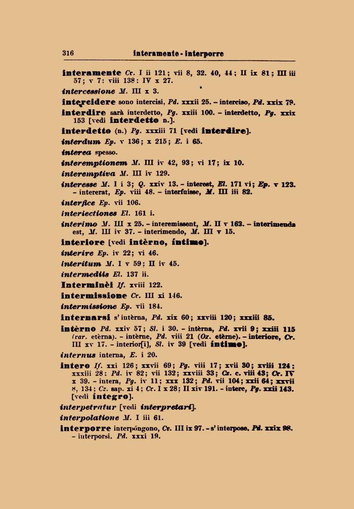 intèrno Pd. xxiv 57; SI. i 30. - intèma, Pd. xvii 9; xxiii 115 (rar. etèrna). - intèrne, Pd. viii 21 (Ox. etèrne). - interiore, Cr. Ili xv 17. - interiori], SI. iv 39 [vedi Intimo].