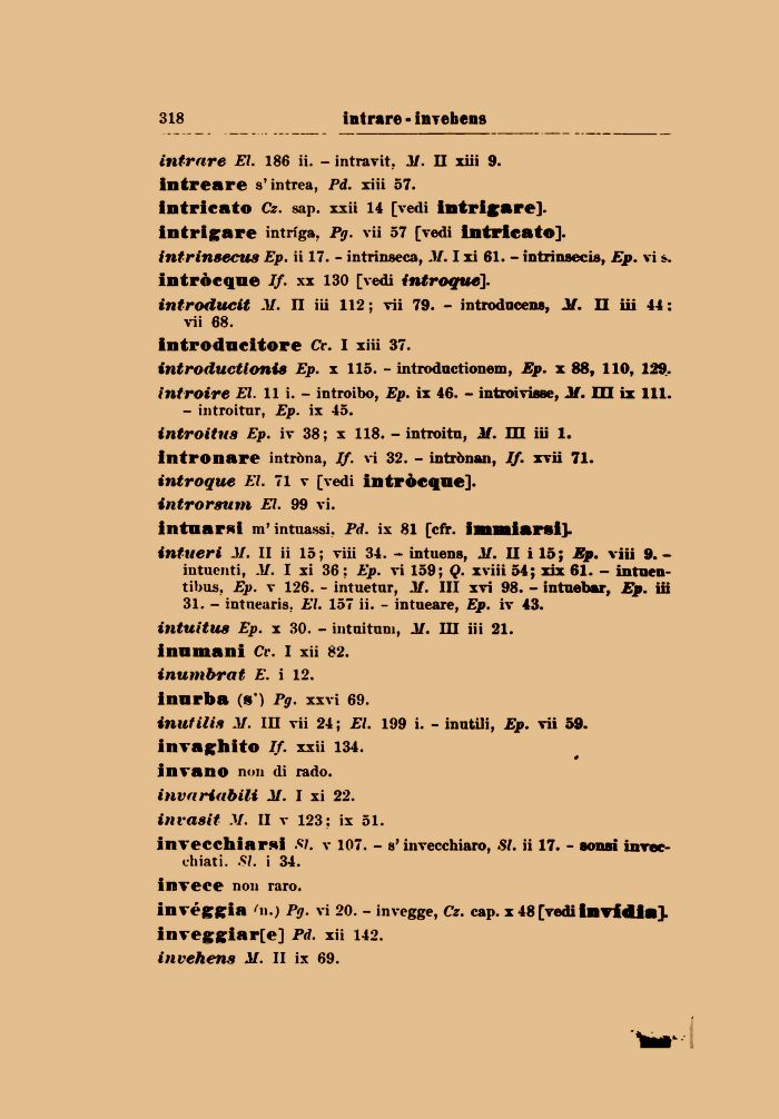 intrare El. 186 ii. - intravit, il. II xiii 9. intreare s'intrea, Pd. xiii 57. intricato Cz. sap. xxii 14 [vedi intrigare], intrigare intriga. Pg. vii 57 [vedi intricato]. intrinaecus Ep. ii 17. - intrinseca, il. I xi 61. - intrinseci», Ep. vi s. intròcque If. xx 130 [vedi introque].