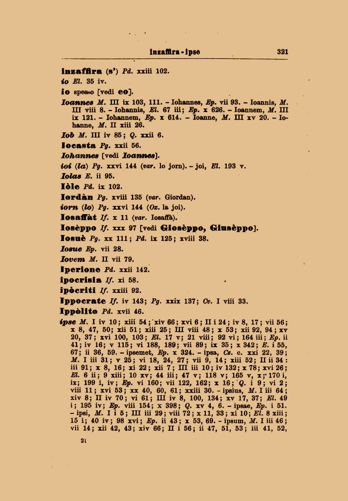 Iordàn Pg. xviii 135 (var. Giordan). iom (lo) Pg. xxvi 144 (Ox. la joi). Iosaffat If. x 11 (var. Iosaffà).