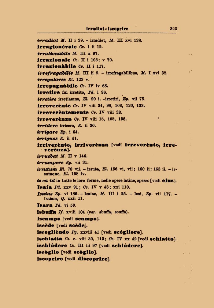 irradiat M. n i 39. - irradiet, M. Ili xvi 138. irragionévole Cv. I ii 12. irrationabile M. Ili x 97. irrazionale Cv. n i 105; v 70. irrazionàbile Cv. H i 117.
