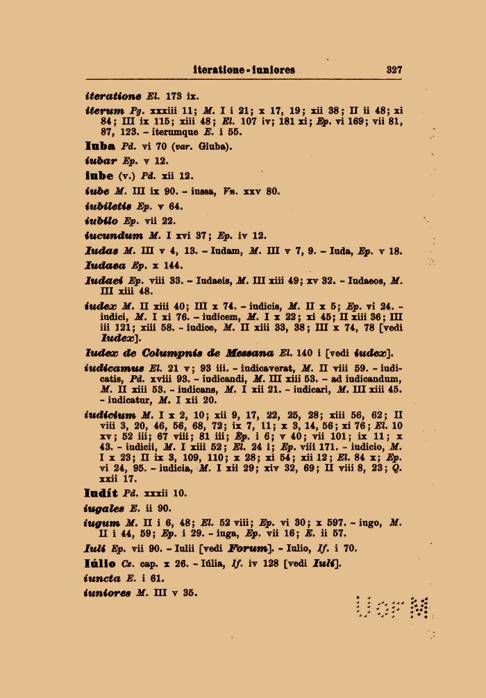iudicium M. I x 2, 10; xU 9, 17, 22, 25, 28; xiii 56, 62; II viii 3, 20, 46, 56, 68, 72; ix 7, Il ; x 3, 14, 56; xi 76; El. 10 xv ; 52 iii; 67 viii; 81 iii; Čp. i 6; v 40; vii 101; ix 11 ; x 43. - iudicii, M. I xiii 52; El. 24 i; Ep. viii 171. - iudicio, M. I x 23; H ix 3, 109, 110; x 28; xi 54; xii 12; El. 84 x; Ep. vi 24, 95. - iudicia, M. I xii 29 ; xiv 32, 69 ; H viii 8, 23 ; Q. xxii 17. Iudlt Pd. xxxii 10. iugalea E. ii 90.