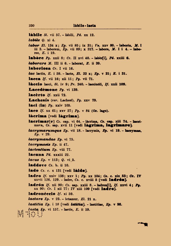 xx 90: Cr. I xii 77 : IV xiii 109 [vedi ladro], ladronéccio If. xi 59. laetare Ep. v 23. - letamur, El. 21 x. laetitia Ep. i 18 [vedi letitia]. - laetitiae, Ep. v 98.
