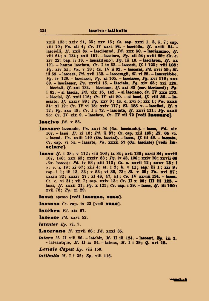 lasso If. i 28 : v 112 ; viii 106 ; ix 84 ; xvii 130 ; xxvii 84 ; xxviii 107. 140; xxx 63; xxxiv 83; Pg. iv 43, 106; xxiv 70; xxvii 66 < Ox. basso); Pd. iv 93; xiii 113; Cr. s. xxvii 12; xxxv 13; i 5: c. x 18; xi 67; xiii 4 ; st. i 2 ; b. v 11 ; sap. iii 1; xii 9: cap. i l; iii 13, 33; v 53; vi 39, 73 ; SI. v 35; Vn. xvi 27 : xxxiii 32 ; xxxiv 27 : xl 46, 47, 51 ; Cv. TV xxviii 134. - lassa. Cz. e. vi 31 : vii 7; sap. xxiv 13 ; Cr. II x 20 ; m iii 123. -lassi, lf. xxxii 21 ; Pg. x 121 ; Cz. cap. i 39. - lasse, If. iii 100: xvii 78; Pg. xi 29.