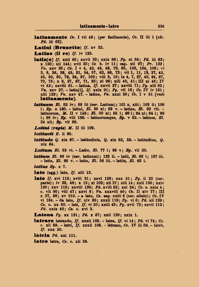 latin[0] If. xxii 65 ; xxvii 33 ; xxix 88 ; Pg. xi 58 ; Pd. iii 63 ; x 120; xii 144; xvii 35; Cz. b. iv 11; cap. xii 97; Pr. 132; Vn. xxv 35; CV. I v 4, 42, 45, 48, 70, 85, 103, 104, 108; vi 3, 8, 36, 38, 45, 51, 54, 57, 62, 66, 72; vii 1, 11, 13, 27, 42, 46, 60, 65, 76, 84, 97, 102; viii 5, 10; ix 4, 7, 27, 40, 64, 67, 70, 75; x 9, 27, 67, 71, 85; xi 96; xiii 40, 41 ; HI xi 48; IV vi 42 ; xxviii 61. - latina, If. xxvii 27 ; xxviii 71 ; Pg. xiii 92 ; Vn. xxv 27. - latin[i], If. xxix 91 ; Pg. vii 16 ; Cv. IV iv 101 ; xiii 129; Vn. xxv 47. - latine, Vn. xxxi 20; Cv. I v 51 [vedi latinamente].