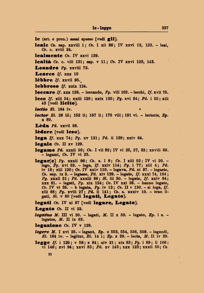 legge If. i 125 ; v 56 ; x 84 ; xiv 21 ; xix 83 ; Pg. i 89 ; ii 106 ; vi 146 ; xvi 94 ; xxvi 83 ; Pd. xv 143 ; xxx 123 ; xxxii 55 ; Cz.
